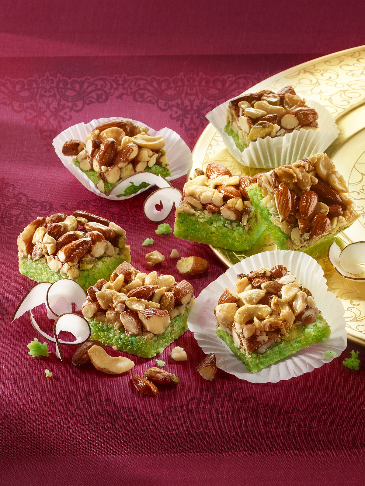 Nussige Backspezialität von El-Salam! Dieses beliebte orientalische Gebäck, eindrucksvoll belegt mit Cashewkernen, Mandeln und Pistazien, verfeinert mit einem Hauch Kokos, passt wunderbar zu einer köstlichem Kaffee oder Tee! In orientalischer Backtradition handgefertigt von der beliebten Berliner Bäckerei & Konditorei El-Salam – jeder Bissen ein Genuss! Einzeln im Papierförmchen und zusammen in einer Klarsichtschale verpackt auch ein schönes Mitbringsel! 250 g.