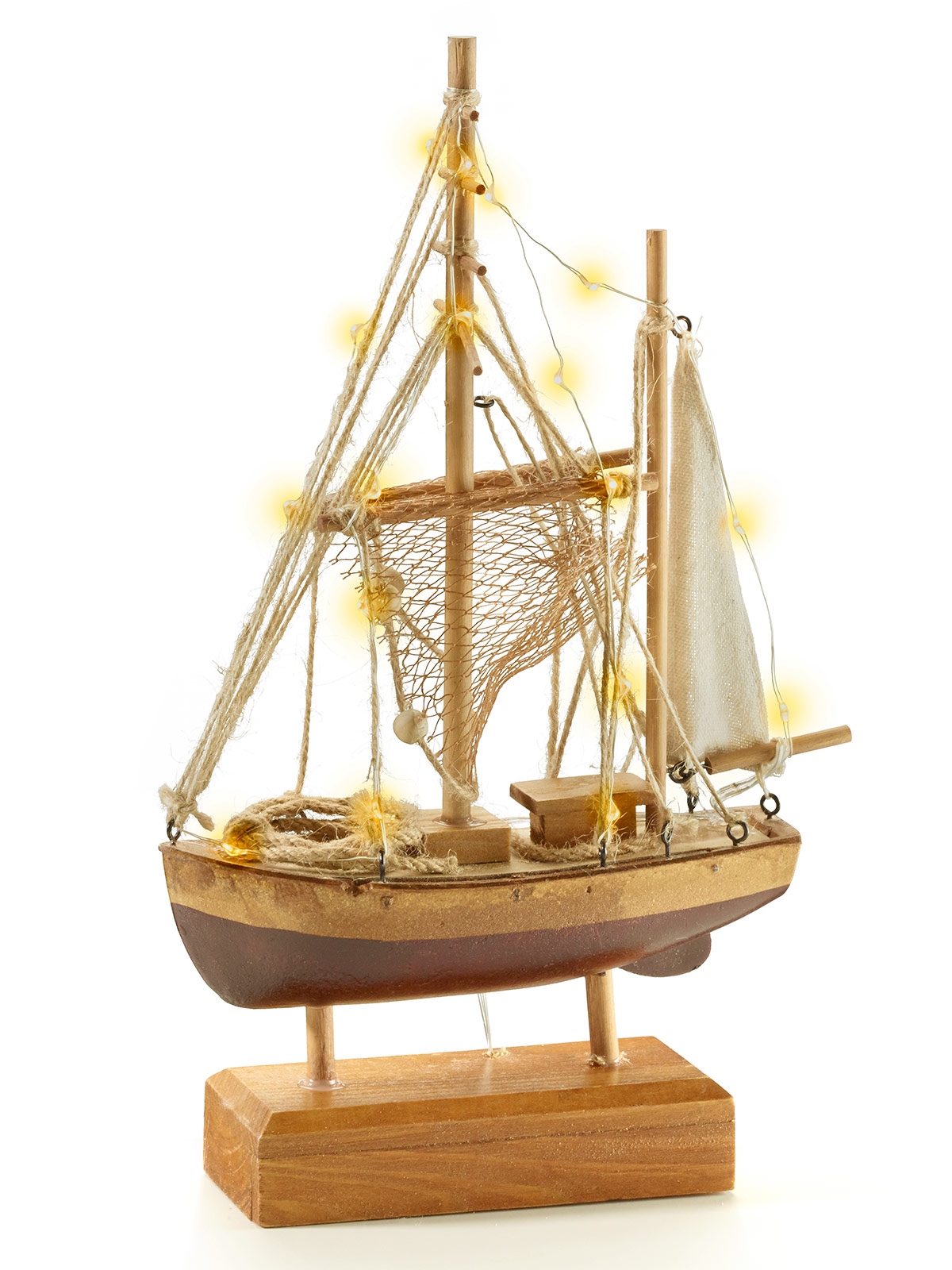 Schiff ahoi – die perfekte Ergänzung für Ihre sommerliche Dekoration ist dieses dekorative Fischerboot! Durch die aufwendige Beleuchtung mit einer 20-flammigen Lichterkette wird das Boot zu einem echten Hingucker. Aus Holz detailliert gearbeitet. Batteriebetrieben mit 2 x AA 1,5 V (nicht im Lieferumfang enthalten). Tipp: gleich mitbestellen. Material: Holz. Ca. 20 x 6 x 32 cm.