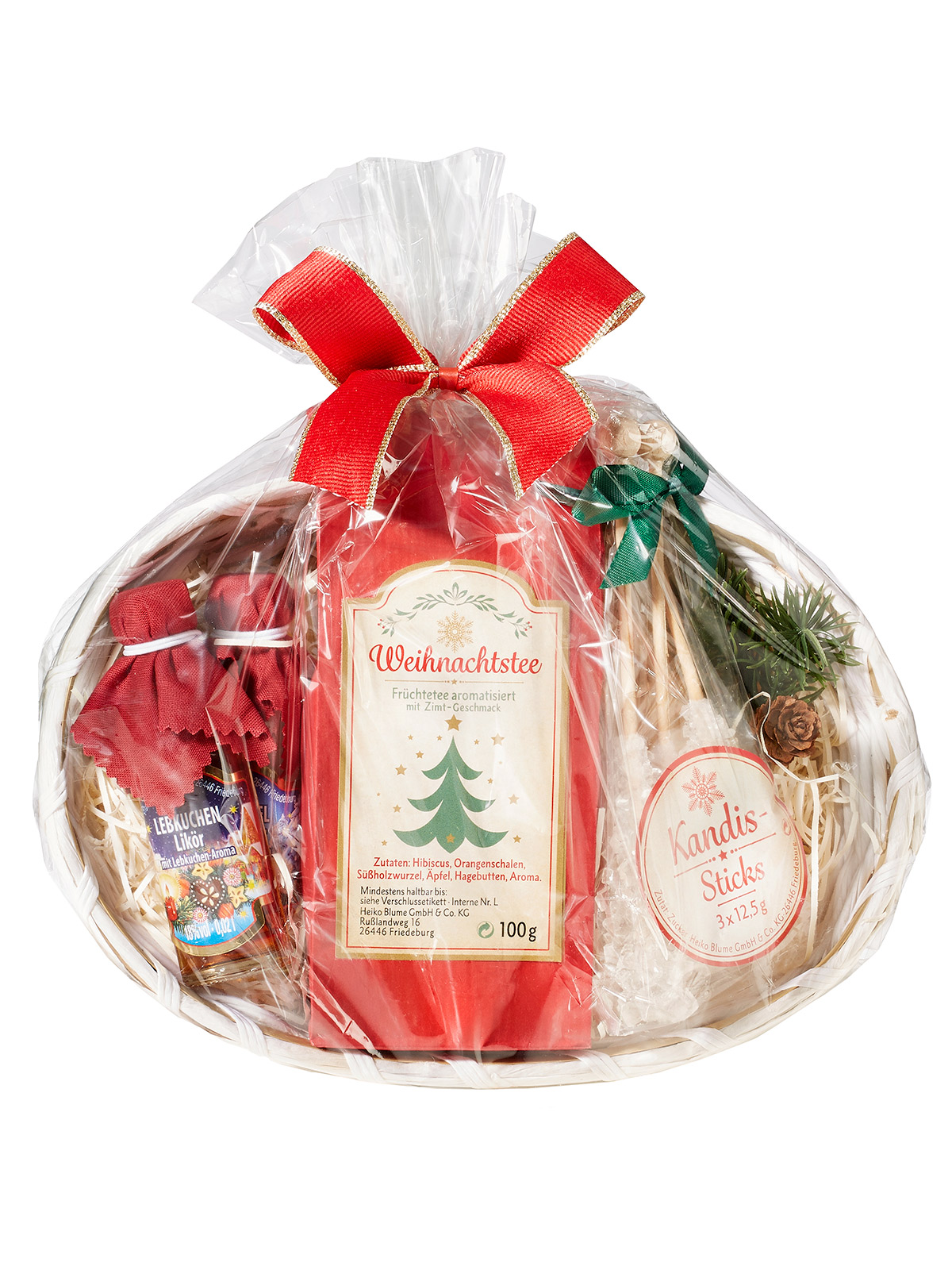 Verschenken Sie Weihnachtszauber pur! Mit würzigem Früchtetee (100 g), edlen Kandis-Sticks (37,5 g) und zweierlei Weihnachts-Likören (18% Vol., je 20 ml). Ansprechend arrangiert & dekoriert, in Folie mit Schleife verpackt im ovalen Präsentkorb aus Bast – ein wunderschönes Präsent, besonders für Tee-Liebhaber. H/B/T: ca. 15 x 22 x 18 cm.