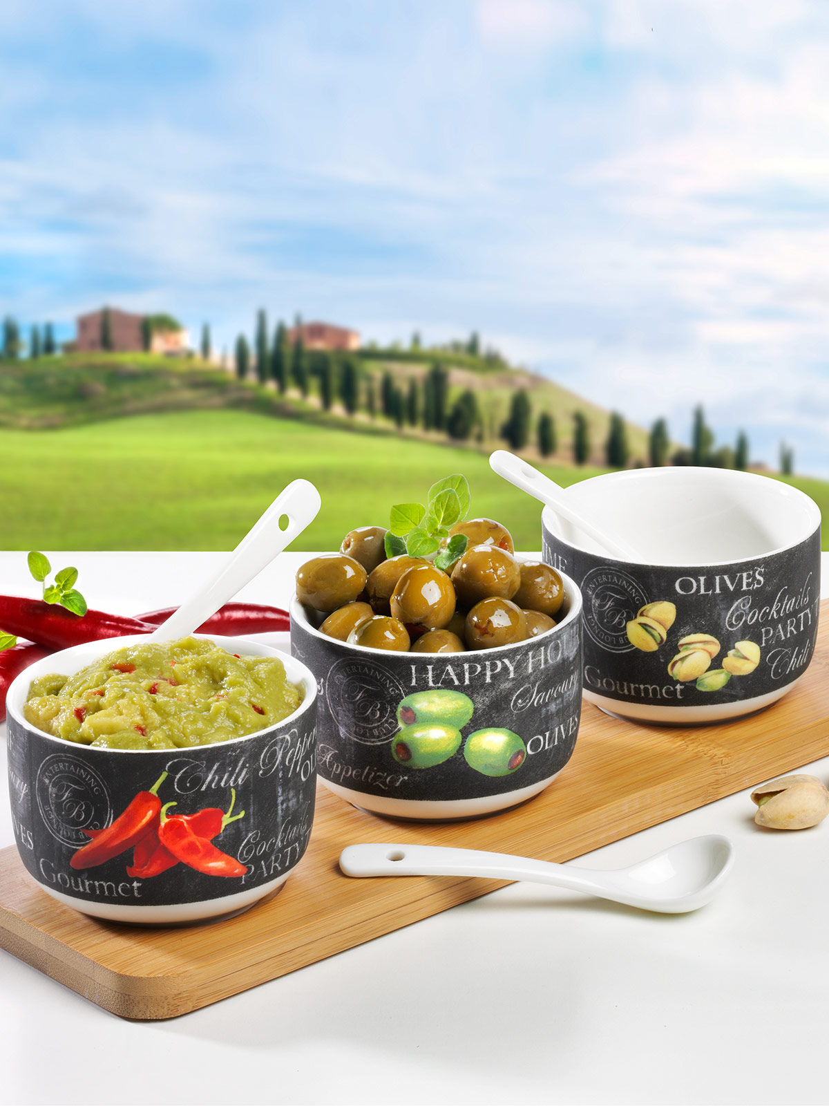 Das etwas andere Tisch-Accessoire! Denn das Auge isst mit. Richten Sie Ihre Dips, Saucen, Oliven oder Tapas in diesen wunderschön mediterran bedruckten Schälchen an. Dazu erhalten Sie 3 Löffelchen. Auf dem sehr praktischen Servier-Bambustablett mit 3 Vertiefungen für die Dipschälchen kann nichts verrutschen oder aneinanderschlagen. Material: Bambus, Metall und Porzellan. Die Schälchen und Löffel sind spülmaschinen- und mikrowellengeeignet. Brett: 37 x 9 cm, mit Tischschonerfüßchen. Servierschalen: Ø ca. 8 cm, Höhe: ca. 5,5 cm. Löffel: ca. 10 cm.