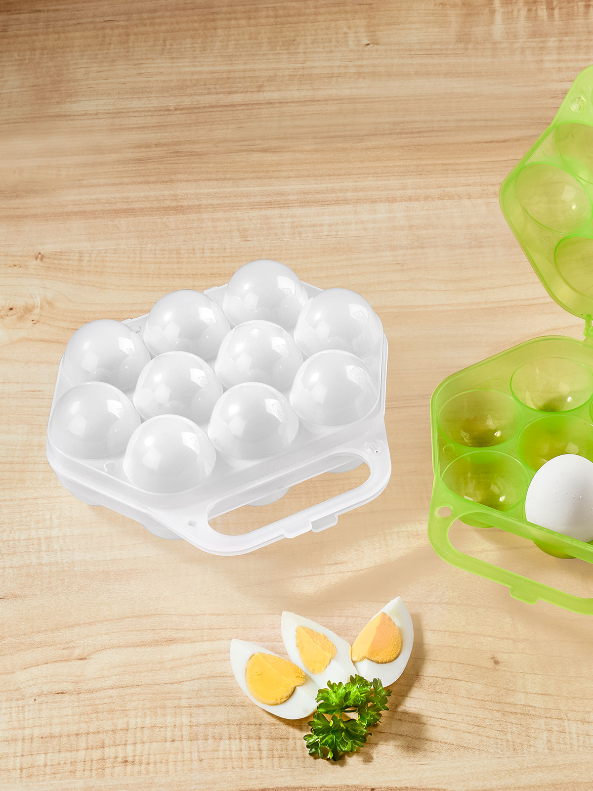 Ei, Ei, Ei – in der Box bleiben sie heil! In den praktischen Eier-Boxen können Sie je 10 Eier sicher aufbewahren und transportieren. Material: Kunststoff. Spülmaschinengeeignet. 2 Stück. Maße zugeklappt: ca. 18 x 18 x 6 cm.