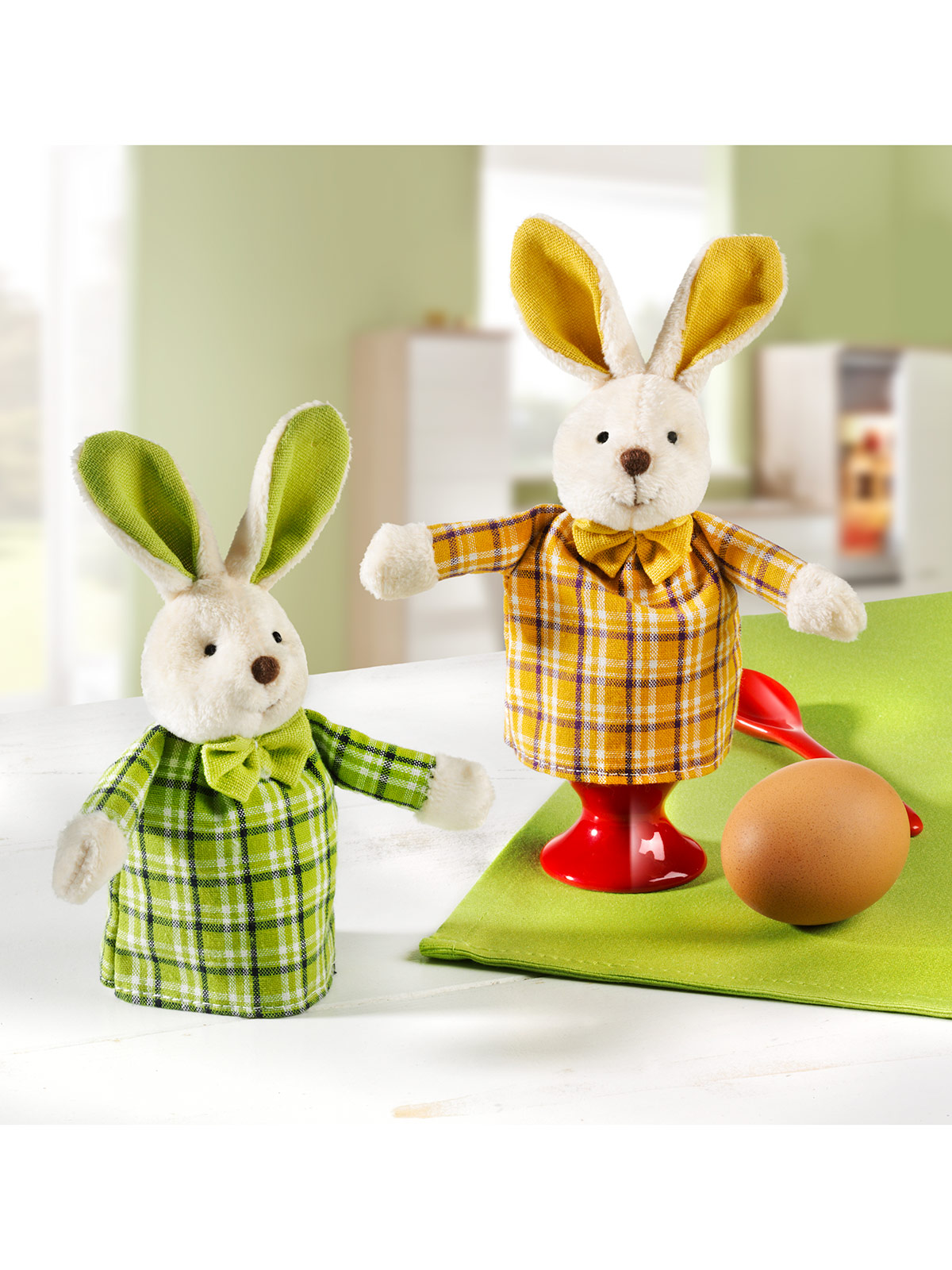 Die beiden Plüsch-Häschen mit Schleife am Hals halten Ihre (Oster)eier unter ihrem karierten Hemd besonders schön warm. Material: 100% Polyester. Höhe: ca. 14 cm.