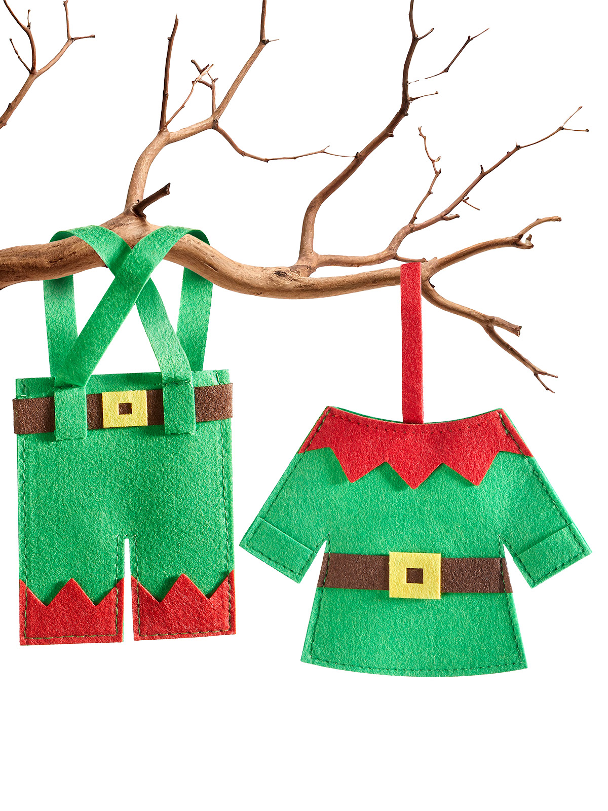 Für Besteck, Geldgeschenke oder Deko! Mit diesem lustigen Taschen-Duo aus 1 Oberteil (ca. 17 x 12 cm) und 1 Hose (ca. 11 x 13 cm) kann man wunderbar allerlei Weihnachtsdinge „verkleiden“. Material: 100% Polyester.