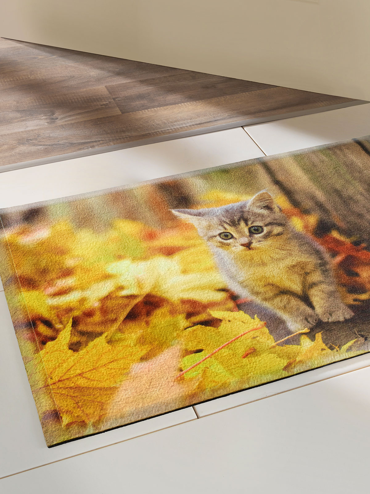 Exklusiv-Design bei Jungborn! Diese Schmutzfangmatte verzaubert nicht nur Katzenfreunde! Diese Matte mit putzigem Kätzchen-Motiv und aufgedrucktem 3-D-Rand erweckt den Eindruck, dass die Matte höher scheint, als sie mit ihrer Gesamthöhe ist. Aus robustem Vliesstoff mit rutschfester Gummi-Rückseite für guten Halt. Nicht waschmaschinengeeignet. Ca. 68 x 45 cm.