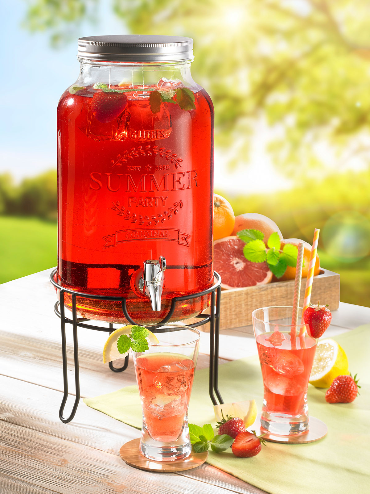 Laden Sie sich Ihre liebsten Freunde oder Nachbarn ein und feiern Sie ein nettes Sommerfest mit köstlicher selbstgemachter Bowle, süffiger Fruchtschorle oder wunderbaren Frucht-Mix-Getränken. Das trendige Glasgefäß dazu, mit Kunststoff-Zapfhahn, Blechdeckel mit Schraubverschluss, sowie einen stabilen Gefäßständer bekommen Sie bei uns. Greifen Sie gleich zu! Material: Glas, Gefäßständer aus Metall. Ø 19 cm. Höhe: ca. 30 cm. Gesamthöhe: ca. 41 cm. Fassungsvermögen: ca. 5,5 l.