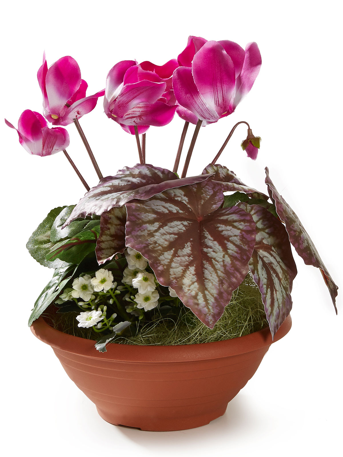 An diesem pflegeleichten Grabschmuck werden Sie lange Freude haben. Die wunderschön bepflanzte Grabschale ist eine echte Zierde auf jedem Grab. Die stimmige Komposition mit Alpenveilchen, kleinen Sommerblüten und Grün aus Kunstmaterial sieht täuschend echt aus. Material: Polyester, Kunststoff. Ø ca. 20 cm. Höhe: ca. 27 cm.