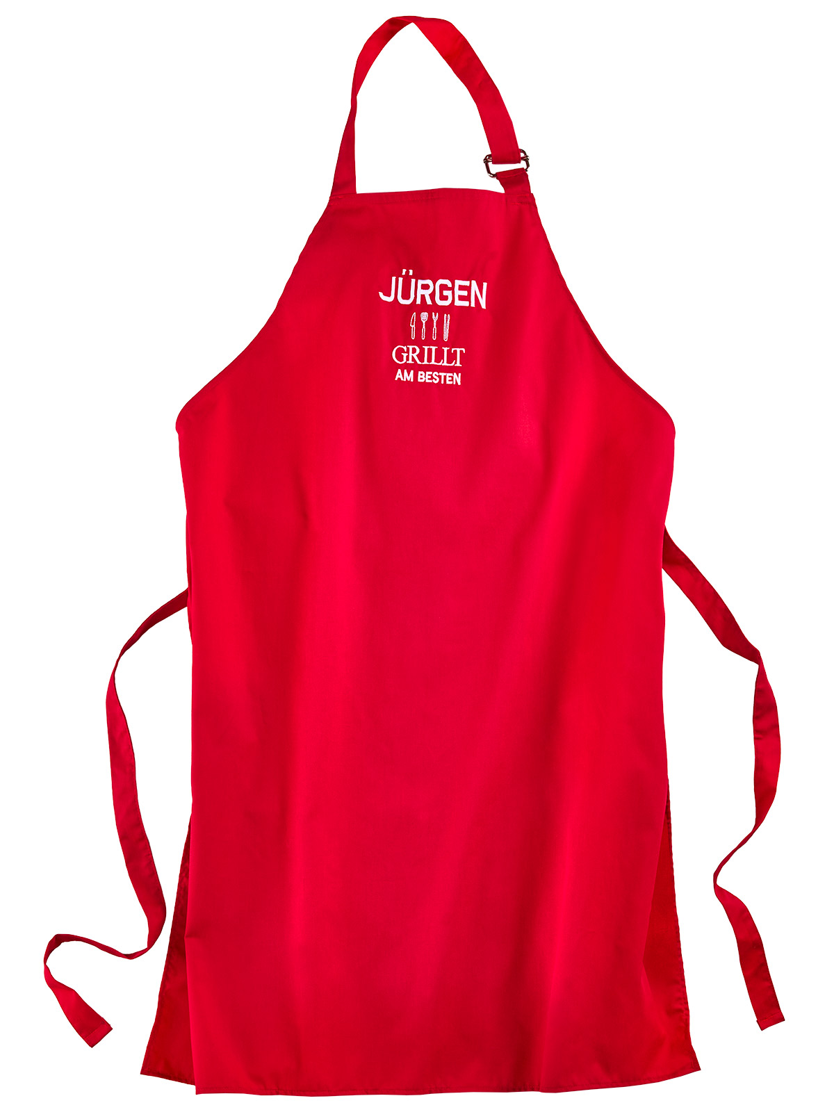 Wer grillt am besten? Der oder die würde sich über diese Schürze mit dem eigenen Namen sicherlich freuen! Hochwertig bestickt, individuell nach Ihren Wünschen. Max. 12 Zeichen. Strapazierfähig aus 65% Polyester und 35% Baumwolle, mit verstellbarem Verschluss. Waschbar bis 60 °C. Trocknergeeignet. Länge 95 cm.