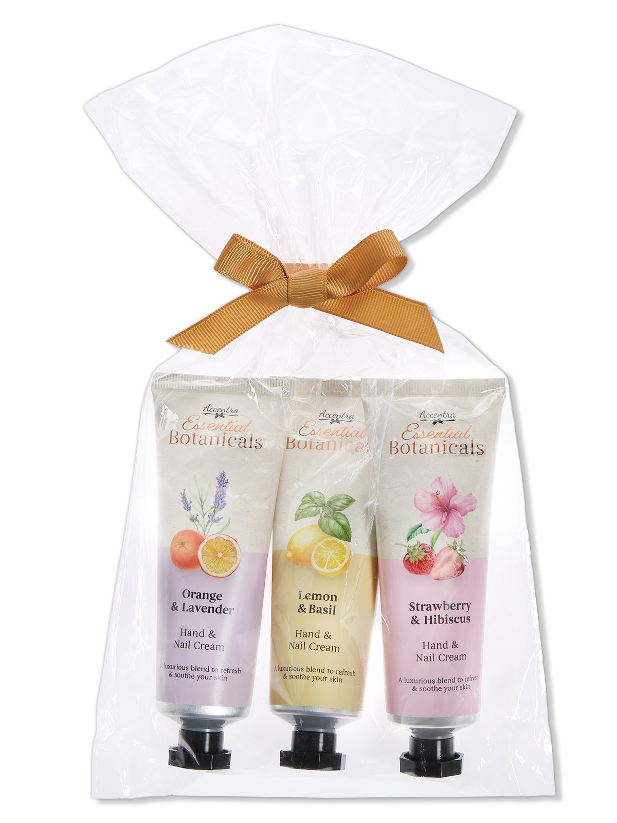 Lassen Sie sich berühren … von luxuriöser Pflege für Hände und Nägel mit verführerischem Duft in 3 traumhaften Sorten: Orange & Lavendel, Limone & Basilikum sowie Erdbeere & Hibiskus. Geschenkfertig in Folie verpackt mit hübscher Schleife. 3 Tuben à 60 ml.