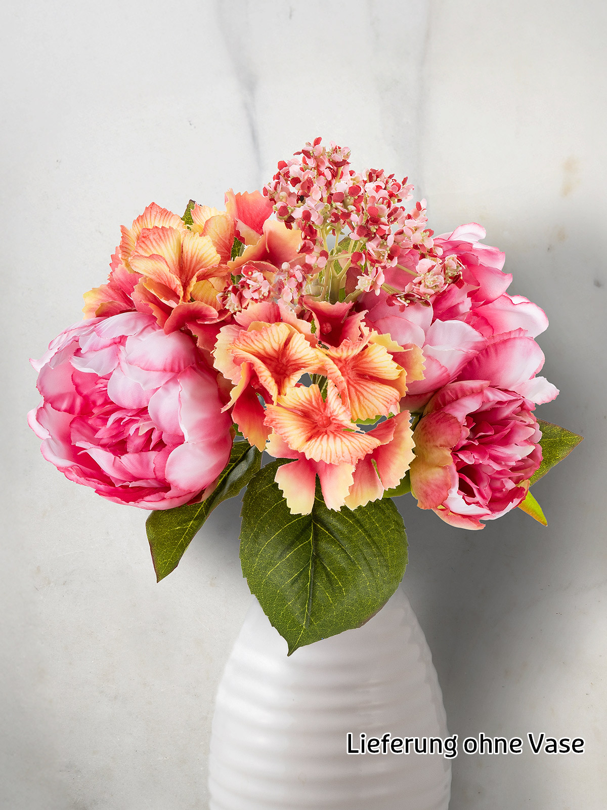 Strauß & Flüssigseife! Dieser wunderschöne, naturnahe Strauß schmückt mit prachtvollen Frühlingsblumen. Material: Kunststoff. 3 Stiele. Ø ca. 15 cm. Höhe: ca. 25 cm. Die hochwertige Parfümseife mit natürlichen Blumenextrakten verwandelt Ihr Bad in eine Duft-Oase. Duft: Peonie & Rose. Im 500-ml-Spender.