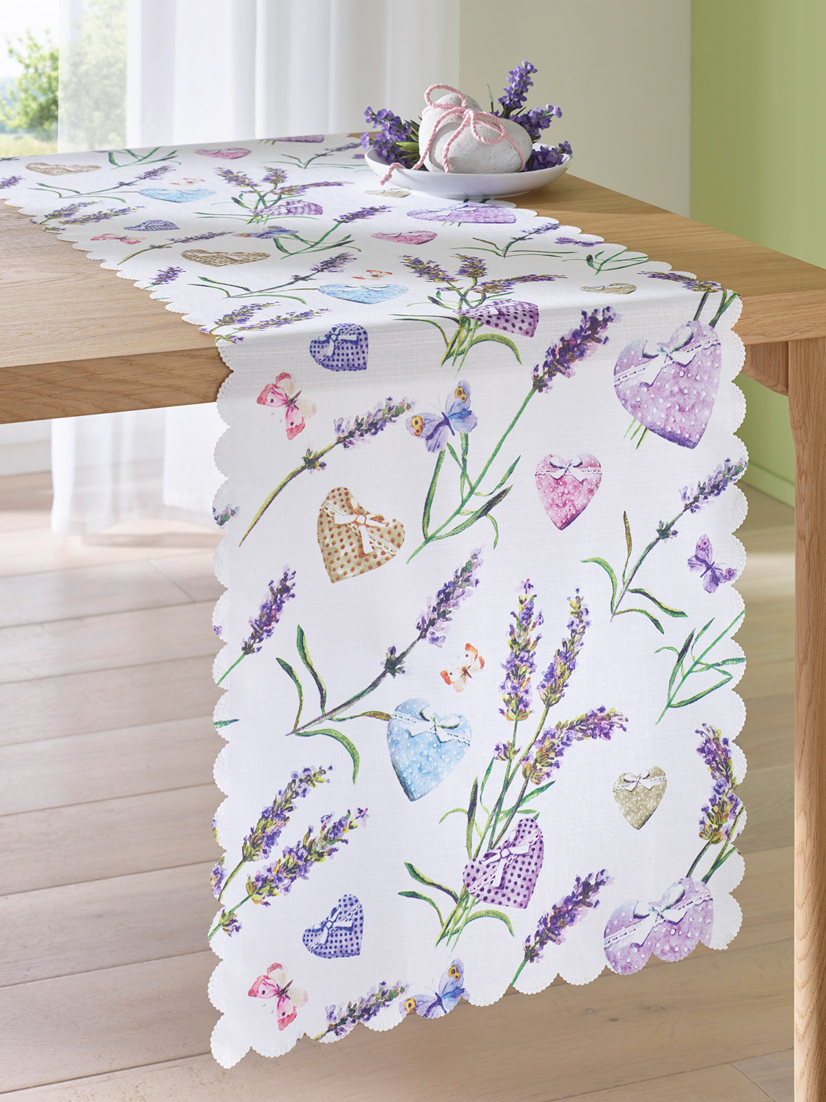 Mitteldecke und gratis Tischläufer! Mit diesem leicht fließenden, blickdichten Tischschmuck genießen Sie einen unbeschwerten mediterranen Lebensstil mit Herz. Aus 100% Polyester. Waschbar bis 30 °C. 85x85 cm + 40x140 cm.