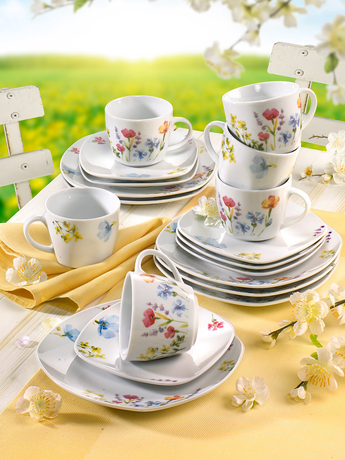 Servieren Sie Blütenträume! Ob für Alltag oder Feste, für den Kaffeeklatsch, fürs Frühstück oder einen Snack – dieses geschmackvolle Kaffeeservice für 6 Personen zaubert immer eine Prise Romantik auf den Tisch! Spülmaschinen- und mikrowellengeeignet. 6 flache Teller Ø 19 cm, 6 Tassen 22 cl, 6 Unterteller Ø 14 cm. Material: Porzellan. Der Versand des Artikels erfolgt in einem separaten Paket.