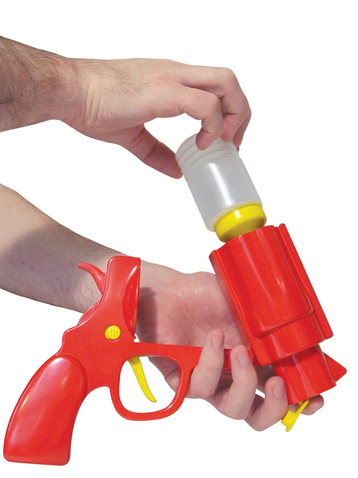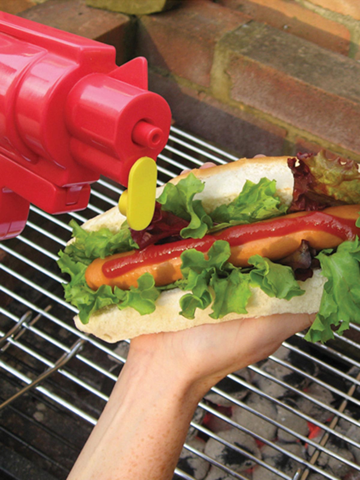 Ein echter Knaller! Da haben die Kinder ihren Spaß - aber nicht nur die. Der Hingucker für die nächste Party, wenn Sie den Gästen den Ketchup oder Senf auf die Wurst „schießen“. Einfach den Abzug ziehen und schon sind Sie der Sieger beim Gourmet-Duell. Der Clou: es gibt zwei „Magazine“ (Behälter). So können Ketchup und Senf oder natürlich auch anderer Soßen oder Mayo gewechselt werden. Diese Pistole schafft garantiert Frieden am Buffet. Material: Kunststoff. Ca. 21 x 16 cm.