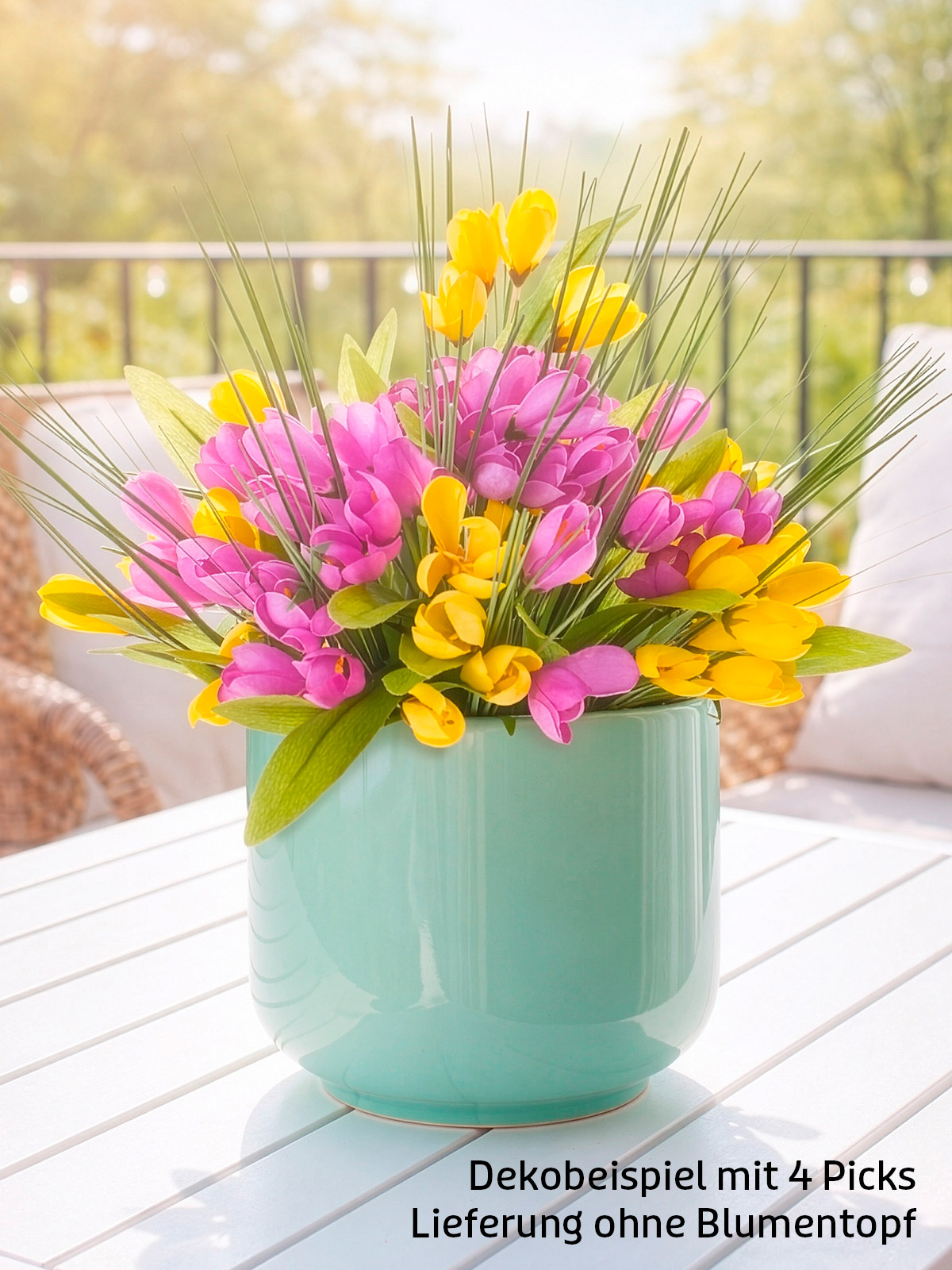Frühlingsbote mit frischem Charme! Bringt neuen Schwung in Ihre Deko – wunderschöner Pick mit zarten Blättern, Krokus-Blüten und Gras für Vase oder Blumentopf. Material: Polyester, Kunststoff. Höhe: ca. 25 cm. H/Ø: ca. 25/18 cm.