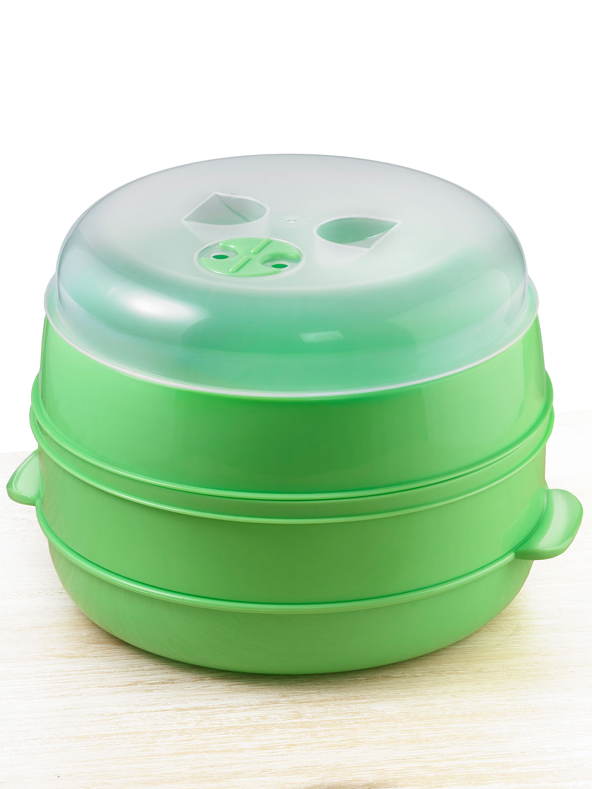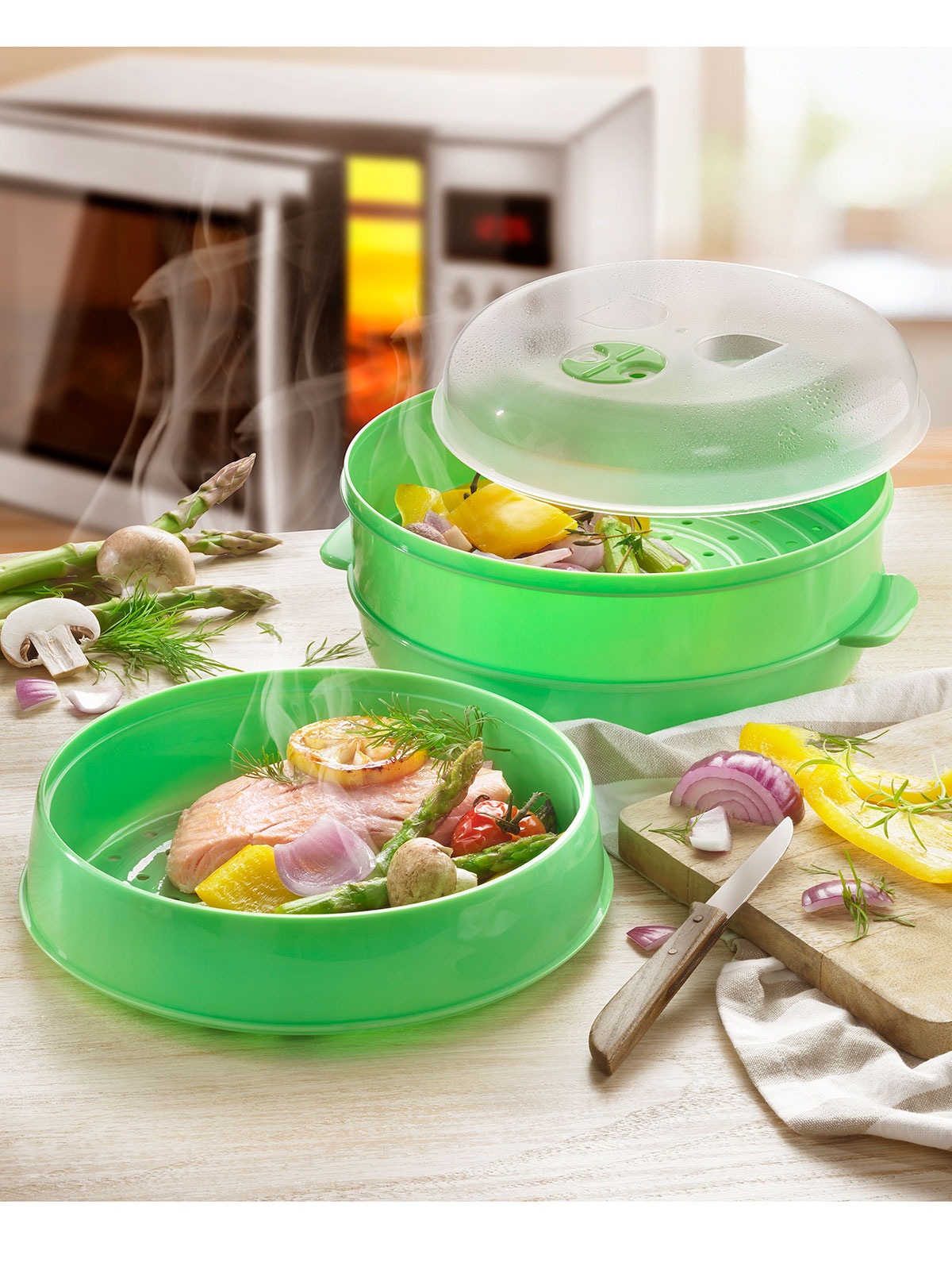 Schonende Zubereitung dank Wasserdampf! Bereiten Sie Ihr Essen besonders schonend, fettfrei und gesund zu. Der Dampfgarer verfügt über zwei getrennte Ebenen, so können Sie unterschiedliche Lebensmittel – z.B. Fisch und Gemüse – gleichzeitig zubereiten. Beide Böden verfügen über eine Siebstruktur und liegen auf einer separaten Wasserschale, so liegen die Nahrungsmittel nicht im Wasser sondern werden nur durch den heißen Wasserdampf gegart. Diese Zubereitung ist besonders vitaminschonend. Der Deckel verfügt über Griffmulden und eine verstellbare Ventilöffnung. Inklusive Beschreibung mit Anwendungshinweisen, Tipps und Garzeit-Tabelle. Für Temperaturen von -30 °C – +110 °C geeignet. Regelbares Ventil im Deckel. Spülmaschinenfest und tiefkühlschrankgeeignet. Material: Polypropylen. Breite: 25 cm, Höhe mit 1 Aufsatz und Deckel: ca. 12 cm und inkl. des 2 Aufsatzes ca. 17 cm.