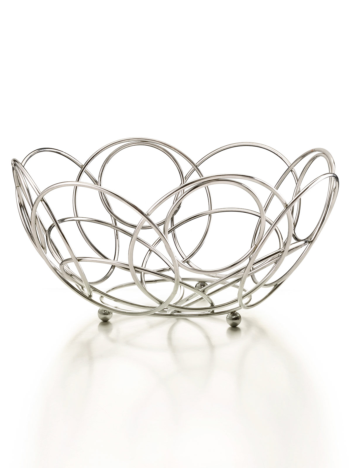 Geschmackvolle und elegante silberfarbene Zierschale im modernem Design. Dank des offenen Designs kann das im Metallkorb gelagerte Obst jederzeit gut gesehen werden. Er ermöglicht zudem eine optimale Luftzirkulation. Als Obst- oder Brotkorb nutzbar. Material: Chrom. Ø ca. 26 cm. Höhe: ca. 13 cm.