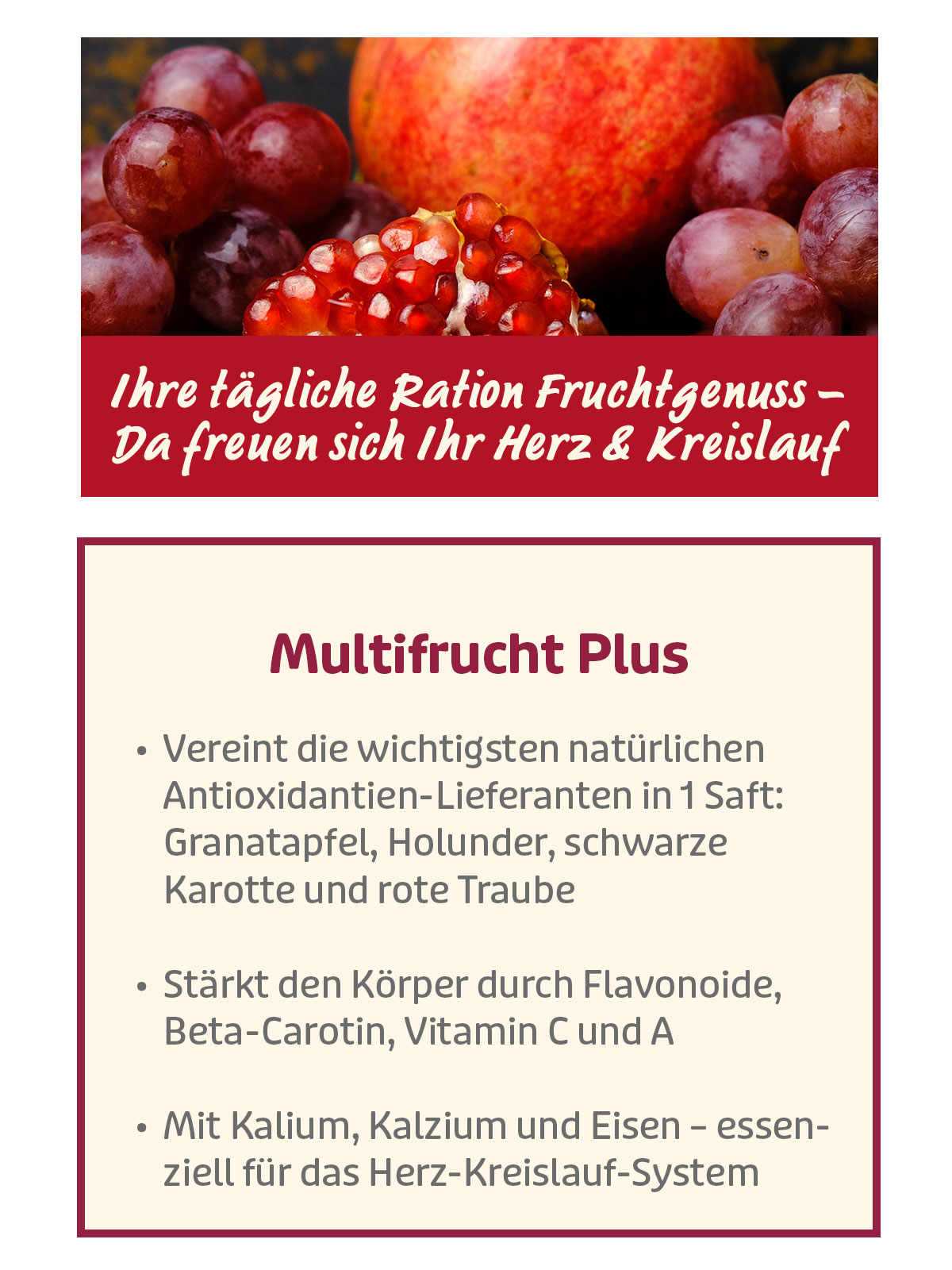 Roter Traubensaft 40,6 %, schwarzer Karottensaft 26,4 %, Granatapfelsaft 17,6 %, Holundersaft 15,4 %