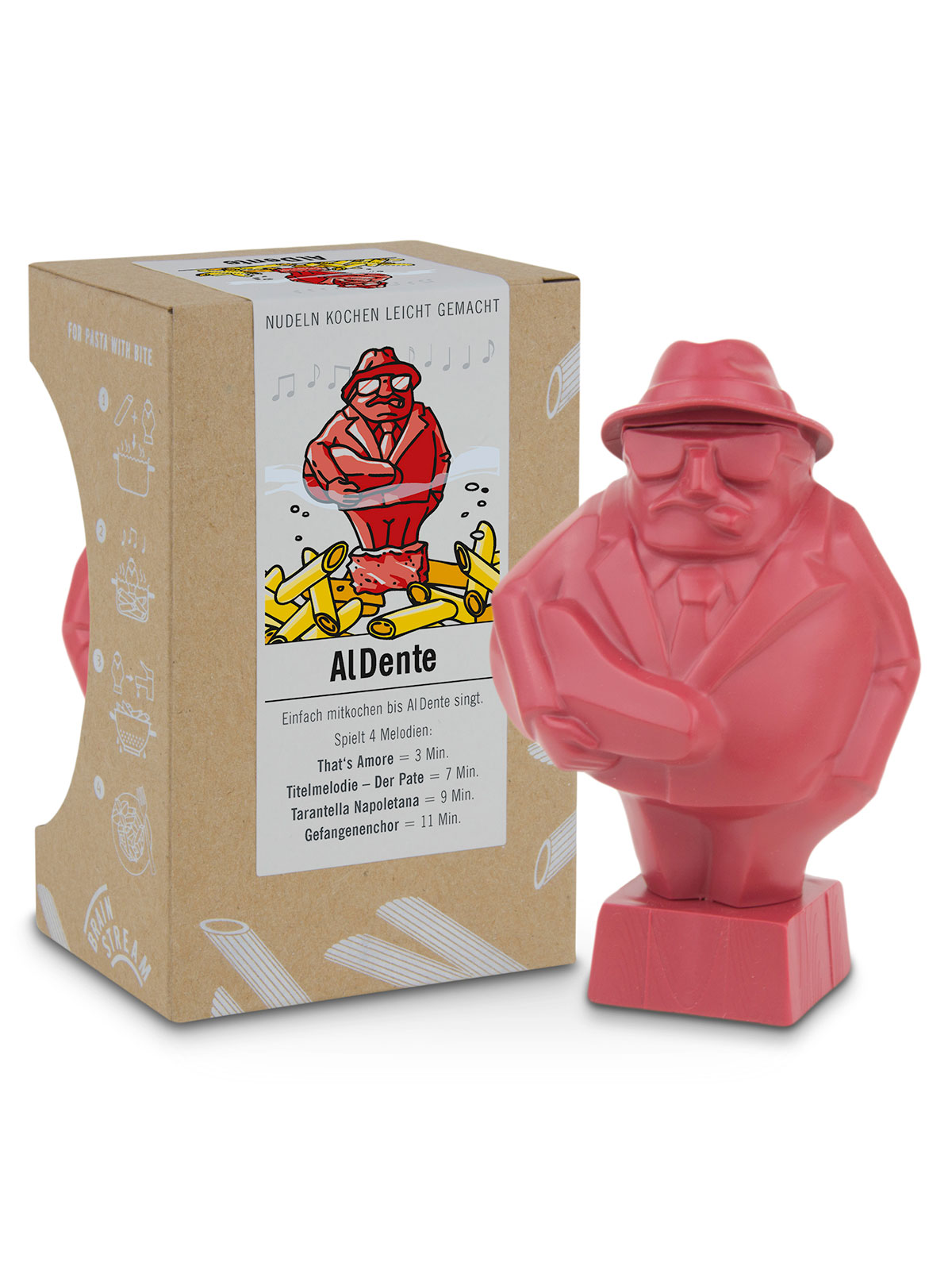 „Al Dente“ sagt matschigen Nudeln den Kampf an. Zusammen mit den Nudeln ins kochende Wasser legen und los geht’s. Sind die Nudeln bissfest, schmettert der Mafioso passende Lieder aus dem Kochtopf. „Al Dente“ spielt vier Melodien für die vier gängigsten Pasta Kochzeiten. „That´s Amore“ - für 3 Min. Pasta. „Der Pate“ - für 7 Min. Pasta. ”Tarantella Napoletana” - für 9 Min. Pasta. ”Gefangenenchor“ - für 11 Min. Pasta. Material: Kunststoff. Mit Anleitung. Die nicht wechselbare Batterie hat eine Lebensdauer von ungefähr 2 Jahren. Höhe: ca. 10 cm.