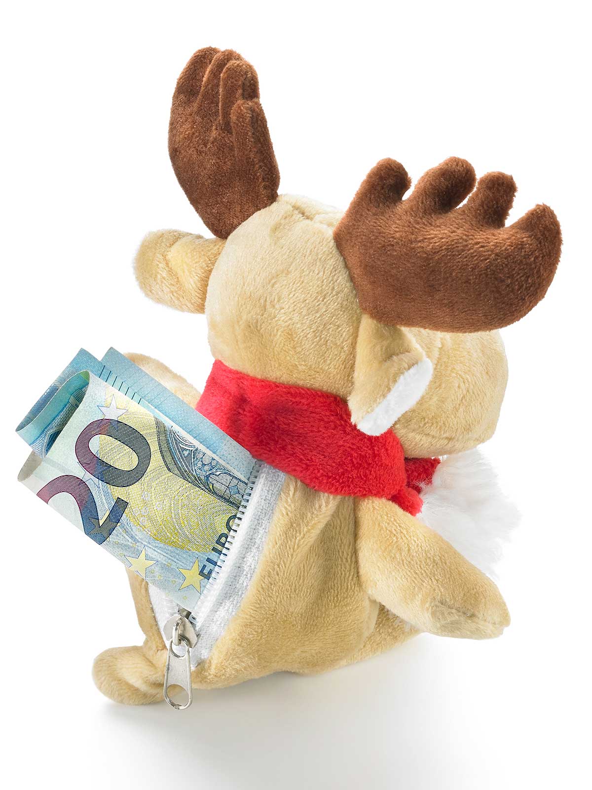 Perfekt für ein weihnachtliches Geldgeschenk! Dieser niedliche Elch mit seinem winterlichem Schal hat an seiner Rückseite eine Reißverschlusstasche für Geldgeschenke oder andere Kleinigkeiten. Material: Plüsch. Höhe: ca. 20 cm. Ohne Inhalt.