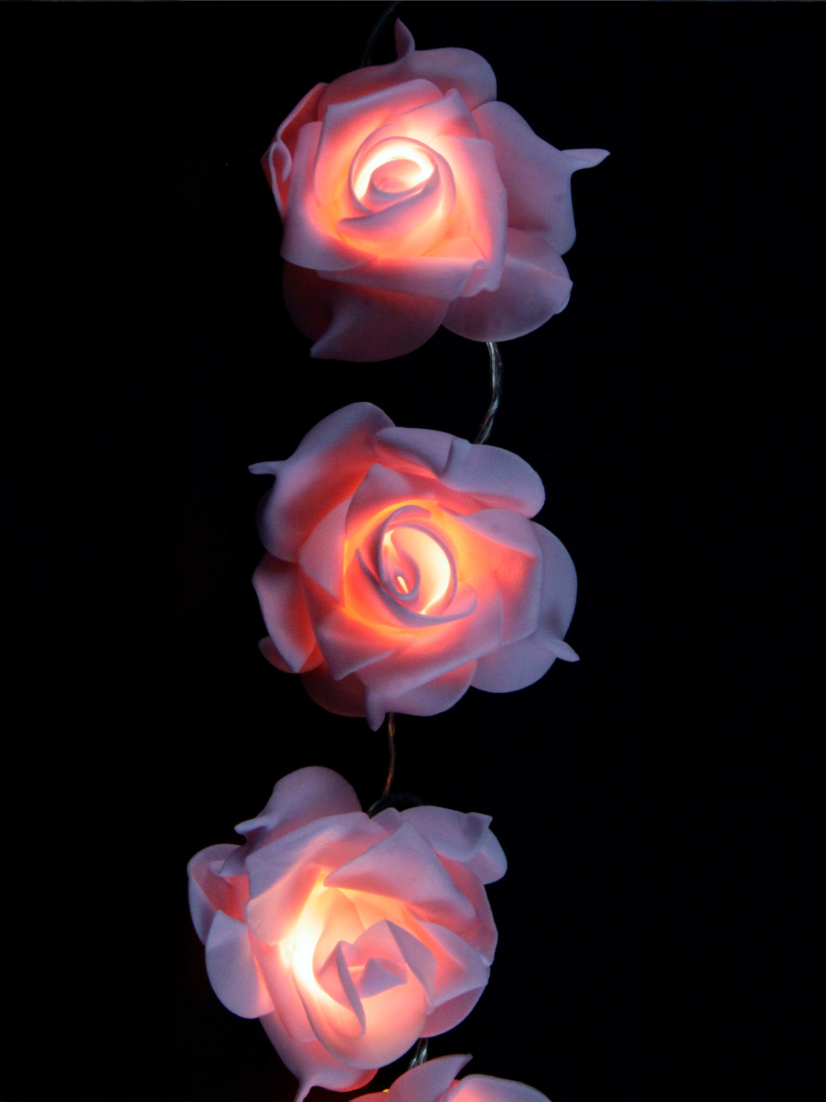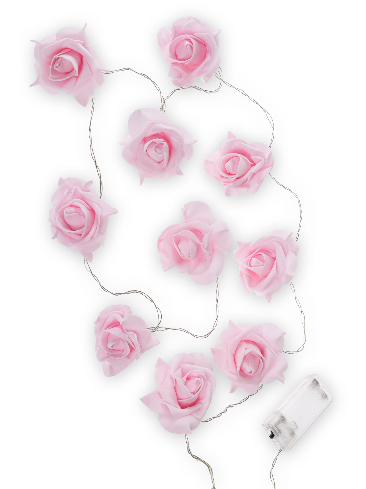 Für romantische Akzente! Jede der 10 zauberhaften Rosenblüten leuchtet mit 1 LED. Material: Polyester, Kunststoff. Batterie: 2 x AA (nicht enthalten). Tipp: gleich mitbestellen! Länge: ca. 180 cm. Ø Rosen: ca. 6 cm.