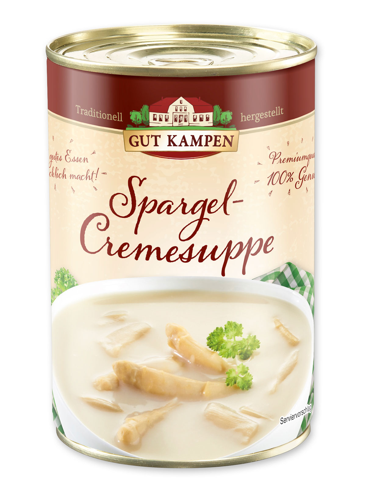 Hochwertige Zutaten und meisterliche Zubereitung garantieren ein kulinarisches Geschmackserlebnis aus dem Hause Gut Kampen. Eine köstliche, hochwertige kleine Mahlzeit mit 21% Spargel und Sahne. Leicht mit Weißwein verfeinert. Tafelfertig, unverdünnt erhitzen. 390-ml-Ringpulldose.