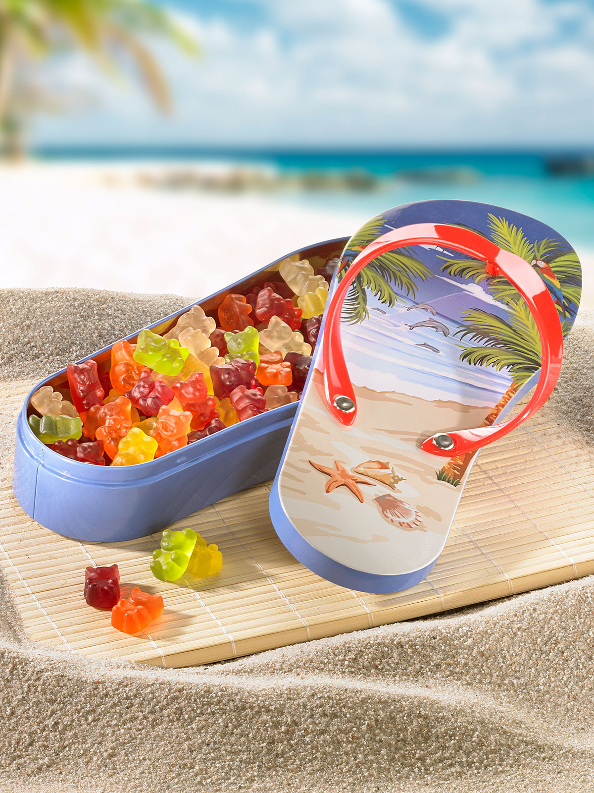 Dieser Flipflop in Dosenform ist die perfekte Überraschung für alle, die z.B. ihren Geburtstag in den warmen Sommermonaten mit einer Gartenparty oder im Urlaub am Meer feiern. Der „Sommerschuh“ kann aber auch in Kombination mit einem Reisegutschein überreicht werden. Gefüllt mit 250 g süßen Fruchtgummi-Bärchen der Hit! Ca. 25 x 10 cm.