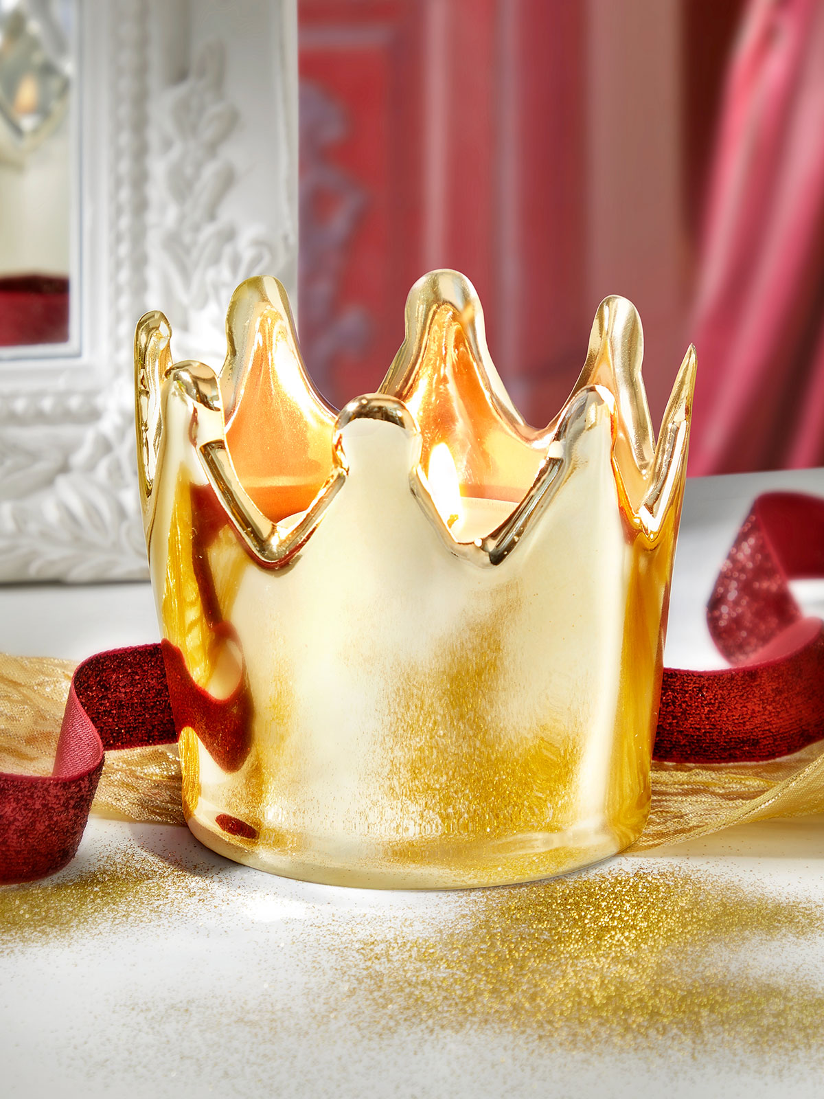 Königliche Kerzen-Leuchtstimmung für Ihr Zuhause – der Teelichthalter in glänzendem Gold ist ideal für XL-Teelichte geeignet. Hier kommt majestätische Stimmung auf! Material: Dolomit. Maße: ca. Ø 9 cm, Höhe ca. 9 cm.