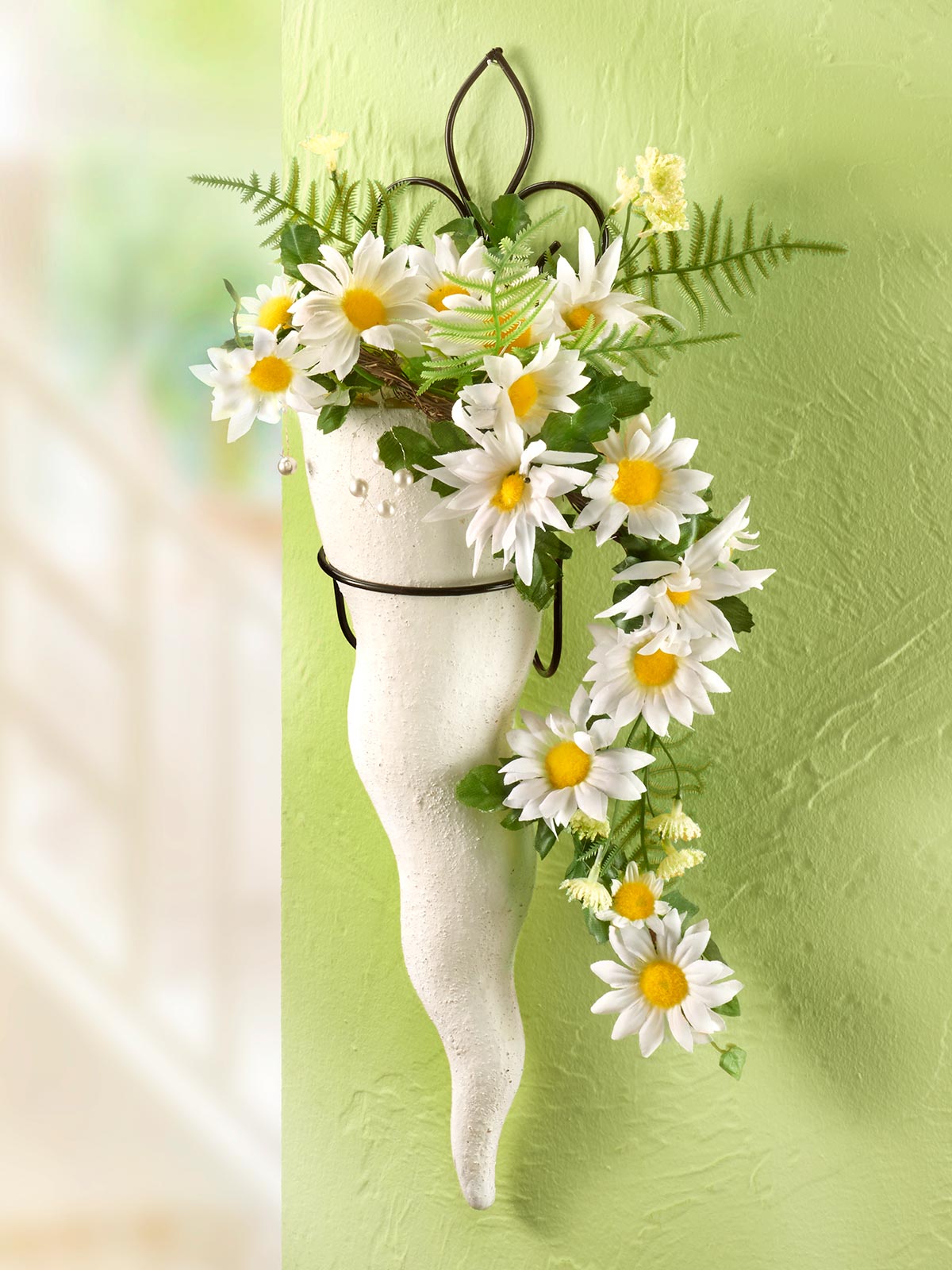 Seien Sie kreativ und verschönern Sie Ihr Heim mit dem frischen Blumen-Schmuckstück für innen und außen! Die liebevoll gearbeitete textile Margeriten-Girlande rankt aus einer weiß gekalkten Terrakottatüte, die von einem kunstvoll gestalteten Metallhalter getragen wird. Material: Terrakotta und Metall, Kunststoff. Höhe: ca. 40 cm.