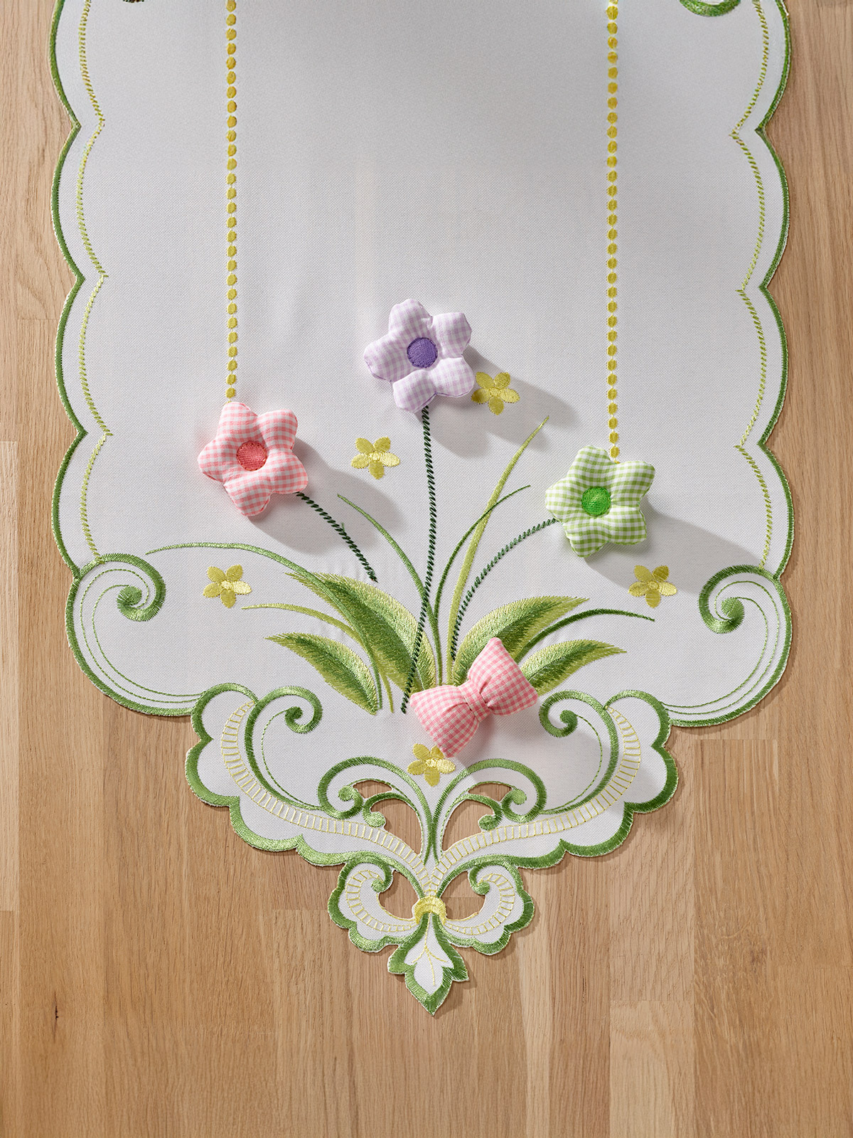 Außergewöhnlicher Hingucker – mit Glanzgarn-Stickerei und aufgesetzten Stoffblumen in sanften Frühlingsfarben. Aus 100% Polyester. Waschbar bis 30 °C. L/B: ca. 90 x 40 cm.