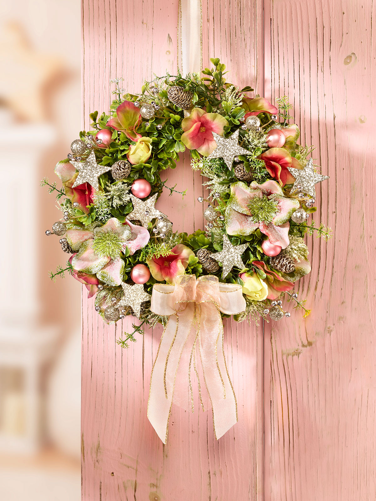 Traumhaften Winterglanz verbreitet dieser prächtige Türkranz auf Rattan gebunden! Mit Christrosen, Hortensien, Kunsttanne und silberfarbigen Kugeln in Altrosa. Mit Glitzersternen und wunderschöner Schleife dekoriert ein funkelnder Blickfang in Ihrem Heim. Länge mit Aufhängeband und Schleife: ca. 50 cm. Ø ca. 24 cm.