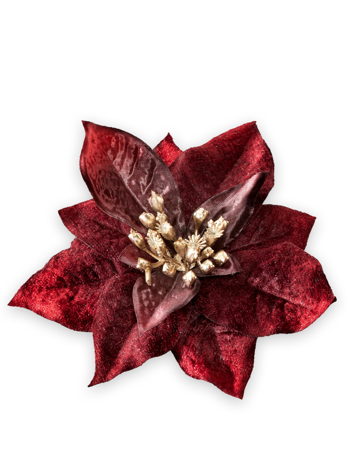 Einfach fix dekoriert! Samtig-glänzende Blütenblätter und goldfarbene Stempel machen diese hochwertige Poinsettien-Blüte zu einem Hingucker an Zweig, Serviette, Kleid oder Geschenk. Zum Anklipsen. Material: Polyester (Samt). Ø je ca. 12 cm.