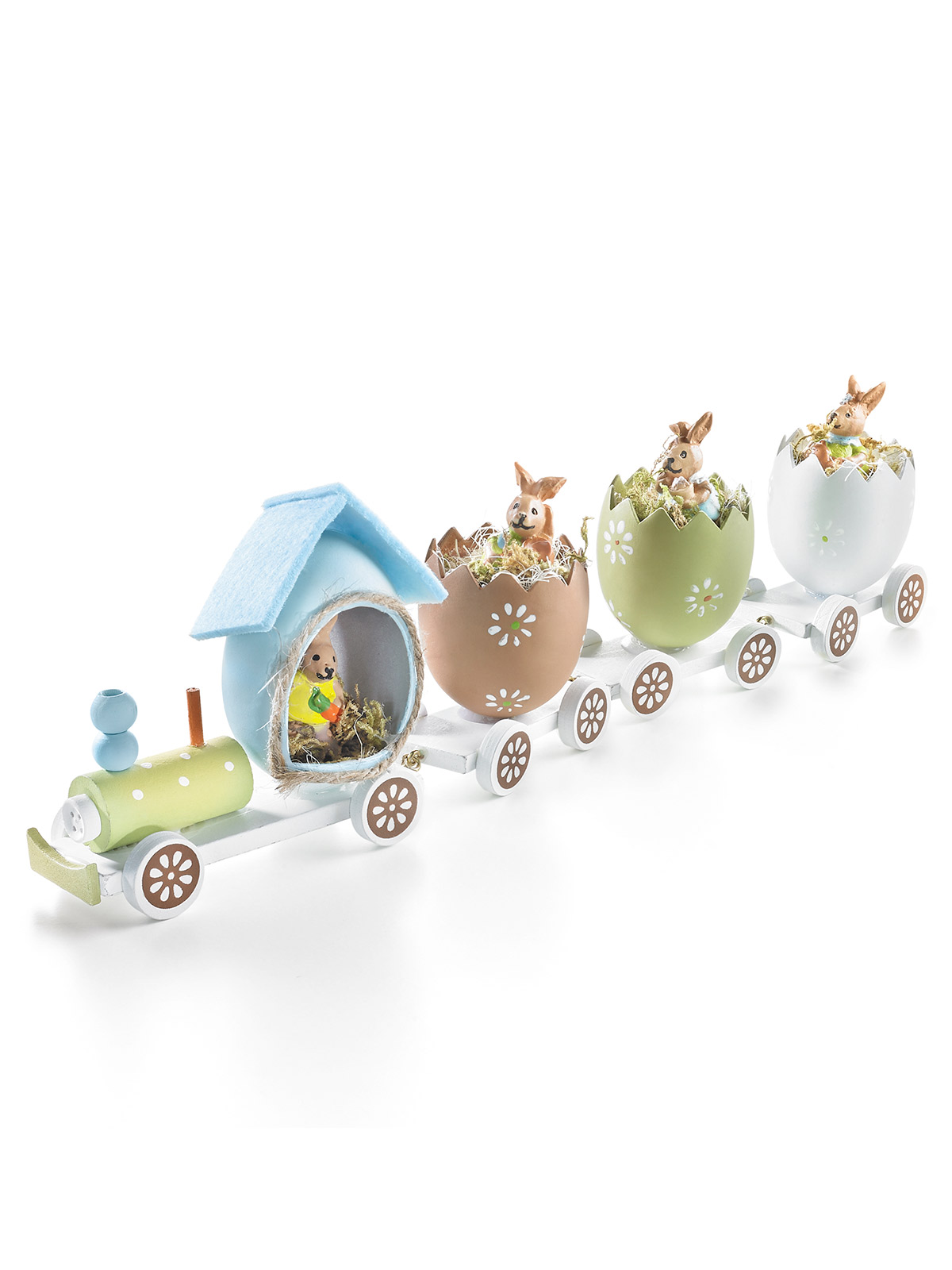 Um diese Deko-Idee werden Ihre Gäste Sie beneiden! Die 4 niedlichen Osterhäschen reisen in der liebevoll handbemalten Lokomotive und den 3 Eier-Waggons! Eine wundervolle Dekoration für Ihre Ostertafel oder eine hübsche Idee zum Verschenken. Material: Polyresin. Ca. 29 x 8 cm.